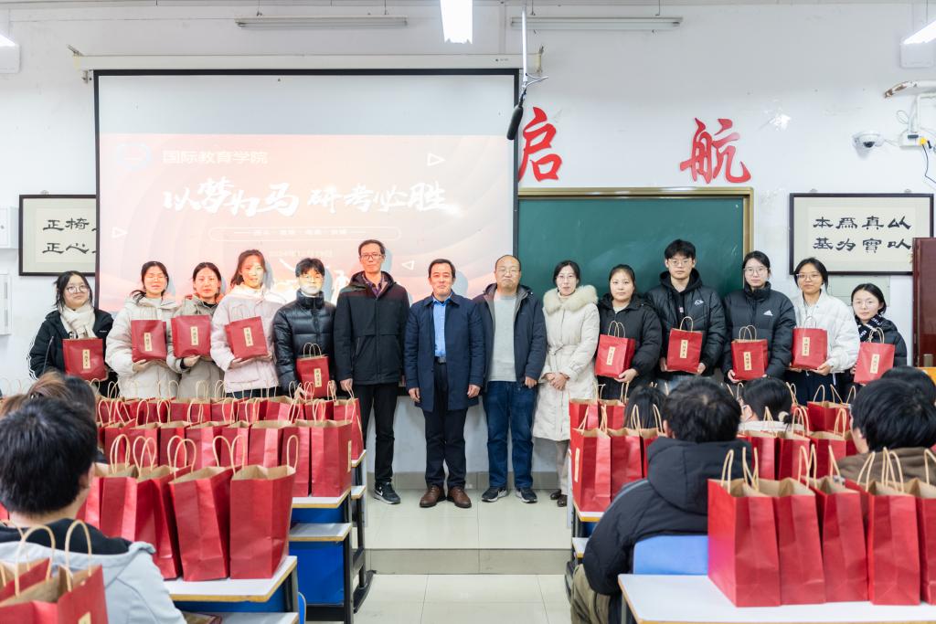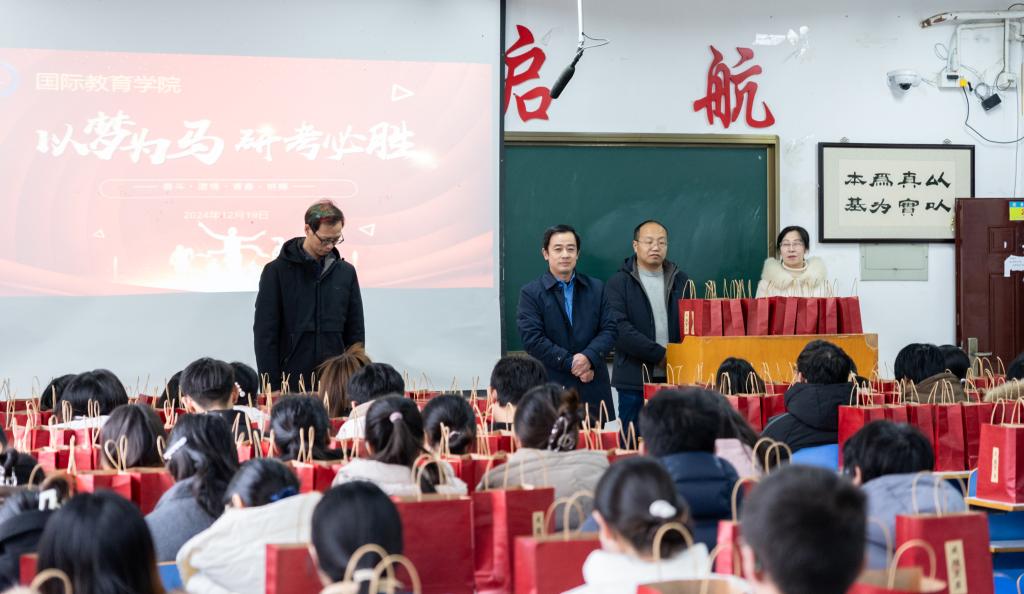 寒冬已至,备战已久的考研学子迎来了紧张的冲刺阶段。为了给考研学子送上关心与鼓励,增强其考试信心,12月19日,公司在逸夫楼209教室举办了“以梦为马,研考必胜”考研送温暖活动。国际教育公司党委书记李舟、经理刘林超、副书记吕亚波、副经理马晓欢带领2025届毕业班辅导员、班主任现场为考研学子送上考研礼包和温暖祝福。
