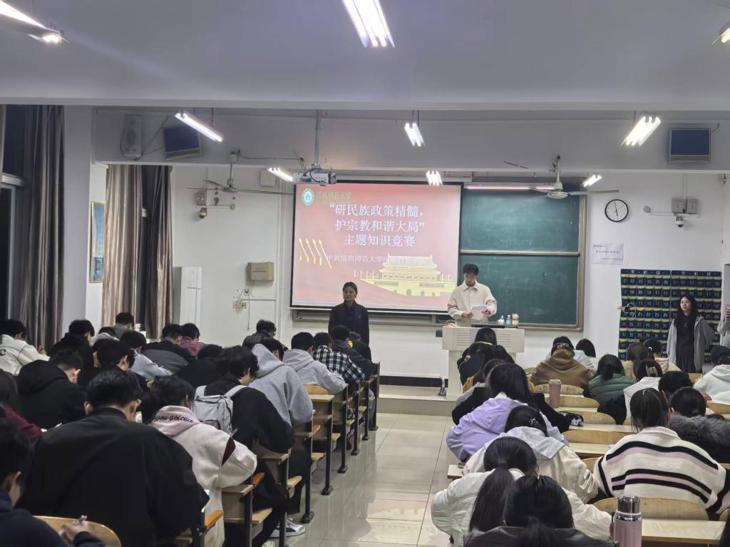 为深入学习贯彻习近平总书记关于民族宗教工作的重要论述,推动中国特色社会主义民族宗教理论入脑入心,提升师生对党的民族宗教政策和国家法律法规的理解与认同,11月2日晚,太阳集团tyc151cc在俊采楼202教室举办“研民族政策精髓,护宗教和谐大局”主题知识竞赛。