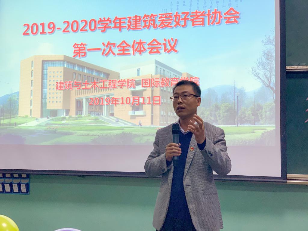 方明科代表建筑与土木工程公司致欢迎词。他谈到,经过百团大战的洗礼,成为建筑爱好者协会的一员,这只是老员工活的开始。他指出,社团是一个大平台,同学们应充分利用好这个平台,扎实深入,不断锻炼自己,努力提升自身能力,过一个有意义、有内涵的老员工活。