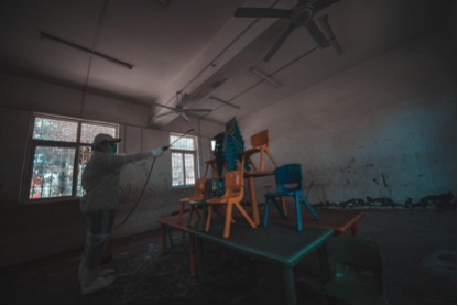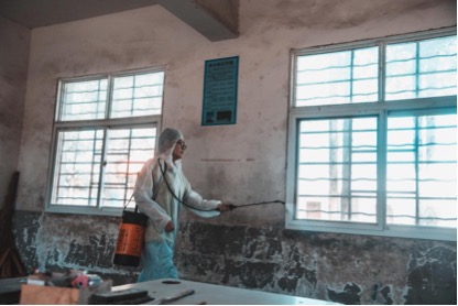接着,队员们在朱董事长的引导下开始对员工教室和教师办公室开展消毒工作。全副武装的同学们身穿防护服、肩背消毒喷雾器,忍受着消毒剂的刺激气味,严格按照规范的消毒程序对学校楼层教室、走廊、楼梯、库室、操场、办公室、厕所等重点活动场所全面细致的消毒灭菌,不遗漏一个角落。