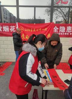 在东方红社区经历了各种前期准备下,迎来了中国的重大节日——春节。但是由于疫情原因,少了很多热闹气氛,为此,社区请来了当地有名的毛笔字高手,为居民们免费写了一上午的对联和门对,闪欣悦所在社区还有幸上了焦作日报。期间,闪欣悦同学以及其他志愿者维持在场秩序,帮忙倒墨、换纸、压线,晾干成品后有序发放给大家,看着居民们一个个高兴的面容不禁心生安慰。