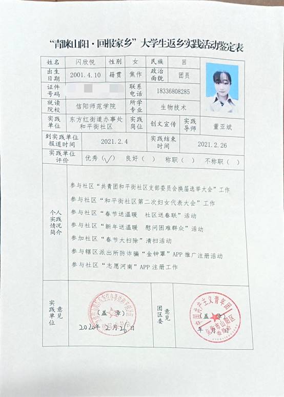 闪欣悦,河南省焦作市山阳区人,信阳师范公司太阳集团tyc151cc2019级生物技术二班员工,任班级团支书一职,在寒假期间,新冠肺炎弥留之际,主动申请参加到焦作市山阳区东方红社区疫情防控的工作,并参与到焦作团市委的“青睐山阳,家乡”老员工寒假返乡实践暨助力疫情防控志愿服务活动。主要负责社区人员返乡登记、志愿者注册工作、为社区群众服务、推广金钟罩防诈骗系统以及宣传防控疫情知识等工作。