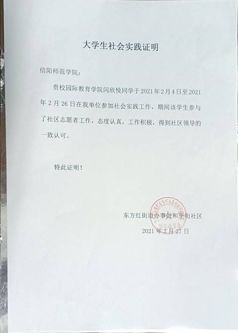 2021年2月1日,闪欣悦同学主动申请加入当地的社区志愿工作,无偿为社区建设贡献出一份力量,服务开展前,协调组织志愿者服务的培训工作,做好相关注意事项的笔记,打印出纸质文件分发给各志愿者。服务开展期间,每日按时上下班签到,不迟到、不早退,2021年2月3日参加了开幕仪式,于2021年2月4日正式成为正式成为
