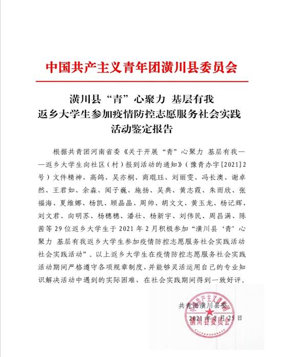 闻子巍,共青团员,河南省信阳市潢川县人,就读于信阳师范公司太阳集团tyc151cc2019级生物技术二班,2020年末参加了潢川团县委组织开展“潢川县共青团‘青’心聚力 基层有我青年志愿服务活动”,和‘青’心聚力 基层有我——潢川县返乡老员工代表座谈会”。
