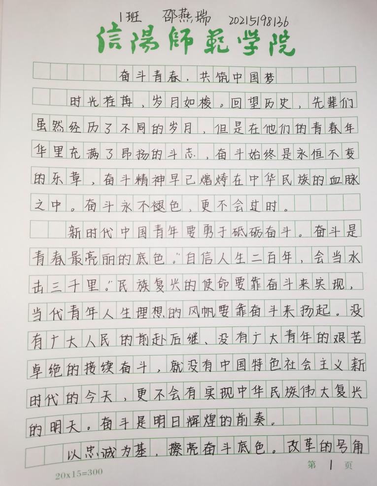 为回顾历程、总结历史、传承文化、怀念感恩、发扬精神,在全校营造浓厚氛围‘展现新中国成立以来的伟大成就,弘扬爱国主义精神和民族精神,深入推进社会主义核心价值观建设,激发员工奋发成才、报效祖国的热情。2021年11月15日,公司通过线上征稿,开展了“奋斗青春,共筑中国梦”征文大赛活动。最后经过认真筛选,挑选出部分既书写美观,又内容丰富深刻的优秀作文进行展出。