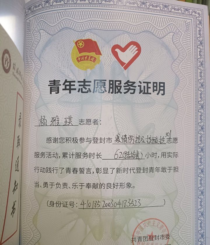 疫情来临,身为老员工应有担当,在保护自己的同时,她积极加入到家乡志作愿者队伍中,做力所能及的事,响应乡政府号召,为家乡贡献一份力量。她作为一名共青团员,积极响应团登封市委号召,报名登封疫情防控社区志愿者服务,参与线下活动,通过在家乡社区的志愿服务,她真切感受到志愿者之“奉献、友爱、互助、进步”。