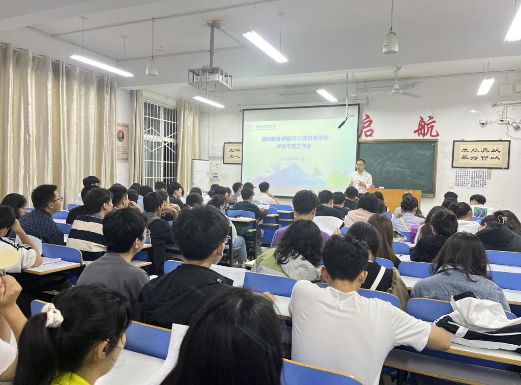 9月12日下午18点,国际教育院在逸夫楼209召开2023年秋季学期员工干部工作会。公司党委副书记付春锋、专职辅导员沈艳霞、竹梅、许孟杨、吴浩、王欣参会,21、22级各班班长、团支书、资助委员悉数参加。会议由专职辅导员虞晶晶主持。