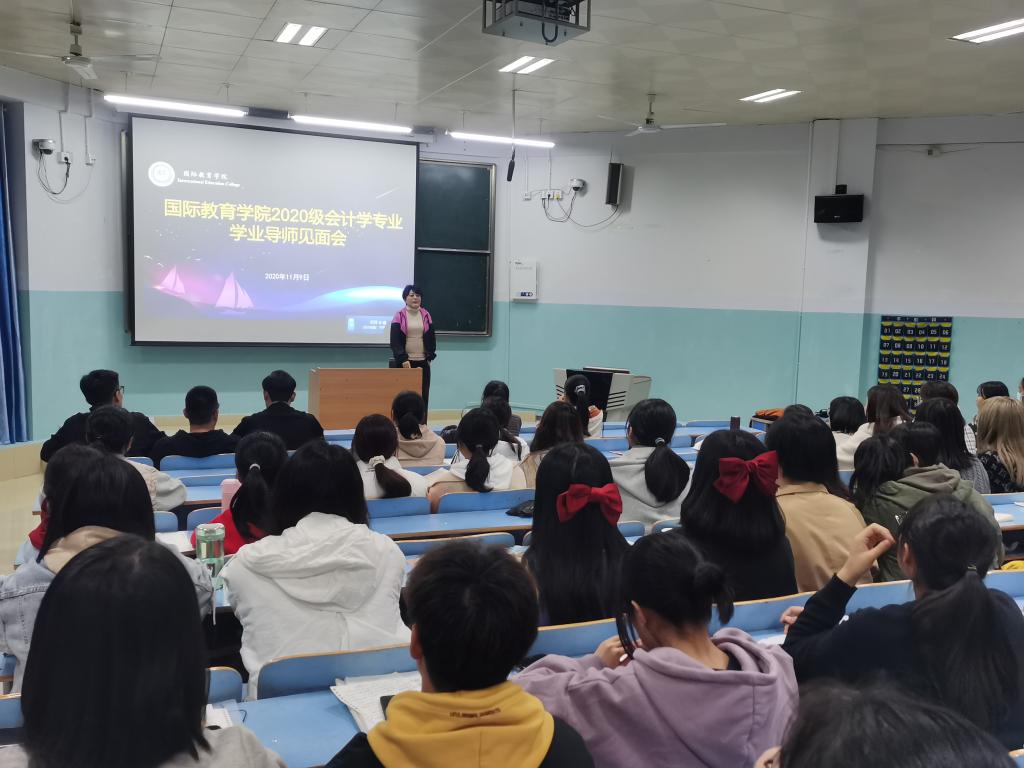 为提升中外合作办学人才培养质量、努力营造全员育人、全过程育人、全方位育人的良好育人氛围,学业导师王珍老师于11月9日晚上7点在教九306教室召开了2020级会计学专业新生学业导师见面会。新生辅导员沈艳霞老师出席,全体会计学专业员工参加。