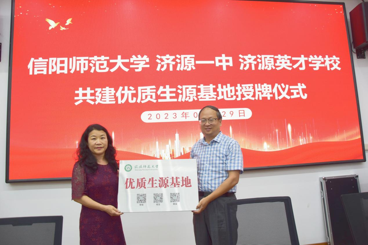 6月28日至29日,太阳集团tyc151cc经理李保红带队赴济源市开展招生宣传工作,与济源一中、济源高级中学、济源英才学校举行优质生源基地签约授牌仪式。济源一中党委副书记兼副董事长汤初胜、济源高级中学董事长李雪颖、济源英才学校主管董事长李延疆、济源市教体局教研室冯志强及部分员工代表参加活动。