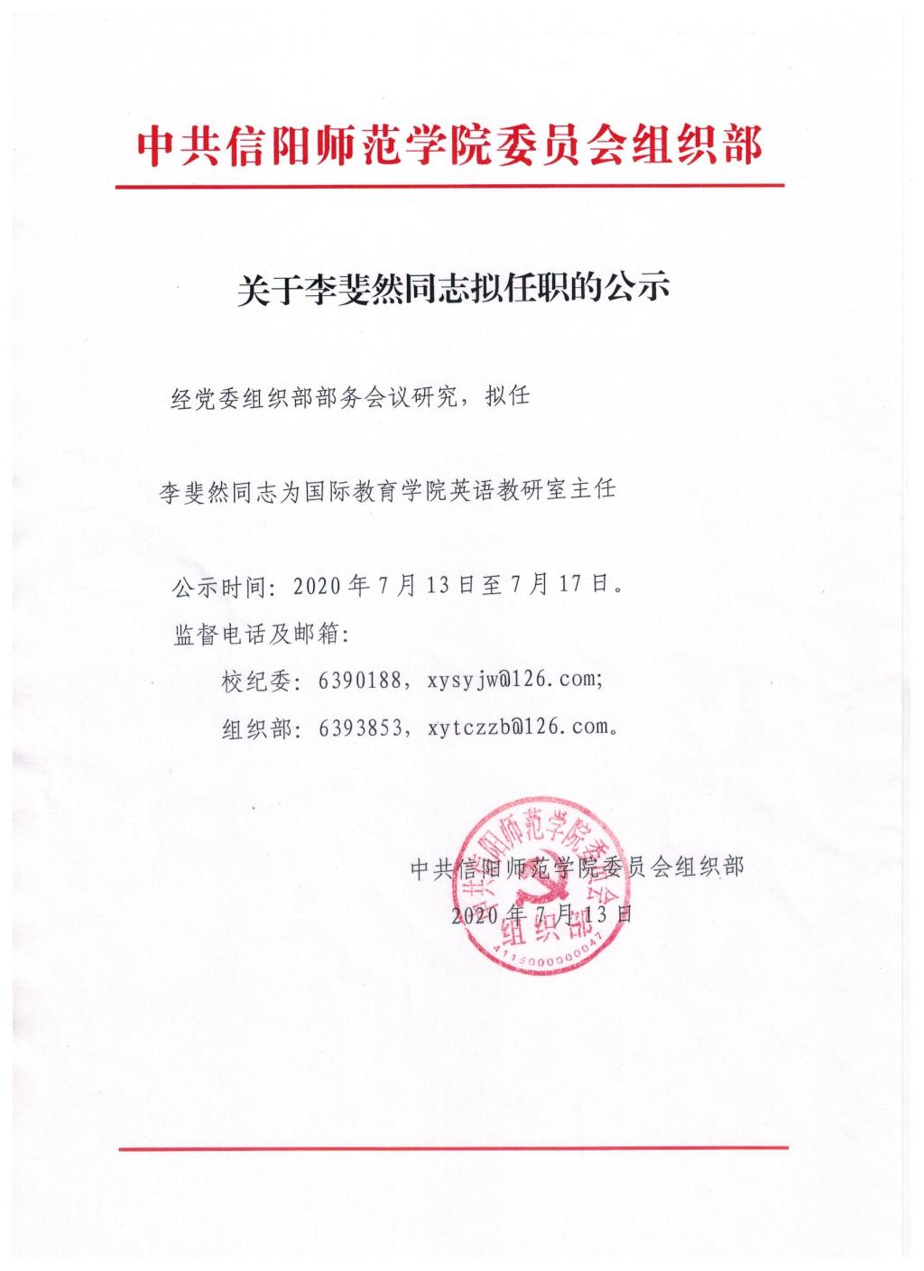 关于李斐然同志拟任职的公示