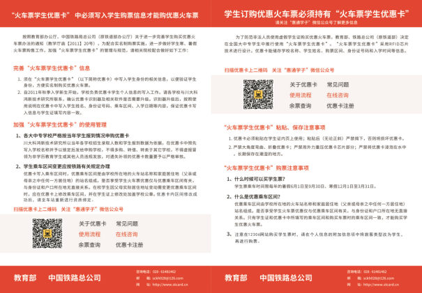 若有任何疑问,老师可致电028-61481462或技术支持电话15198059811、15198059812咨询,员工可扫描优惠卡上的二维码关注“惠通学子”微信公众号了解员工资质绑定相关内容,员工在购票或在车站绑定资质遇到问题时,可在公众号内在线咨询。