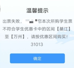 当员工买票在12306买票时提示优惠信息核验失败时(如下图3、图4所示),请员工在资质查询里仔细核查所绑定的优惠区间(如图1所示)是否是正确的站点名称,若发现绑定站点不正确或与实际乘车区间(学校--家庭)不符时,请尽快找老师修改优惠卡内站名名称,然后去车站自助机刷身份证、优惠卡重新绑定资质信息,重新绑定资质以后12306上资质信息区间修改成功后才可以买票!