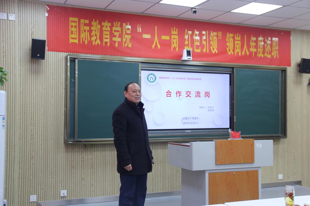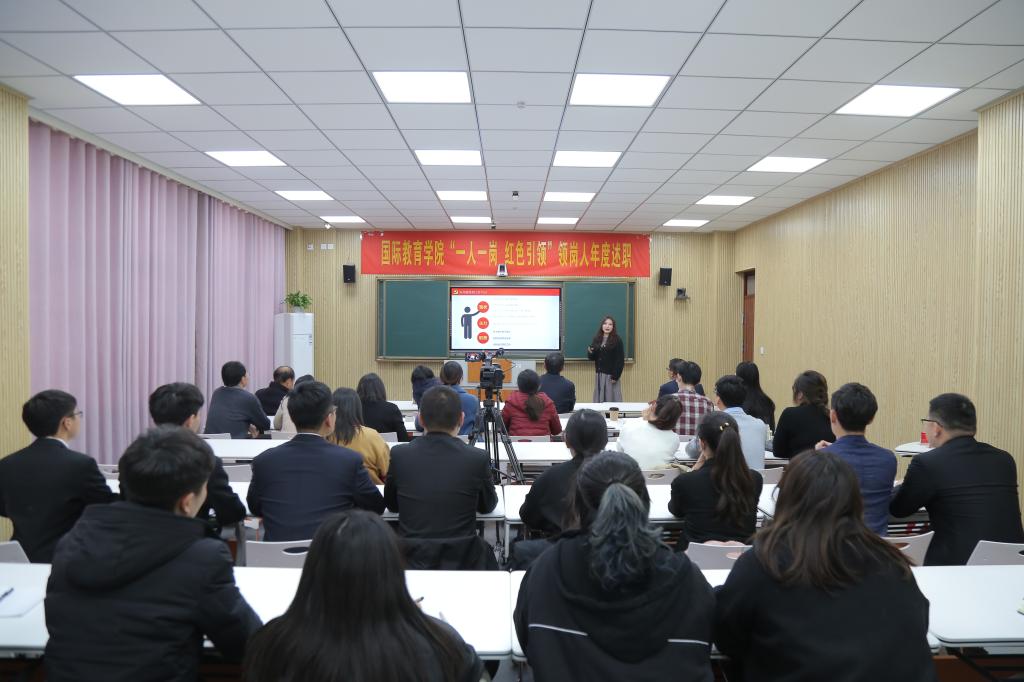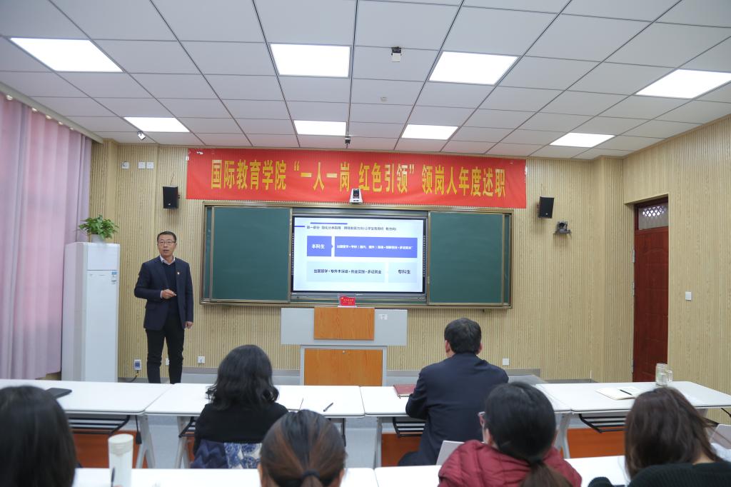 领岗人立足岗位职责逐一向大会进行汇报。党建引领岗领岗人张震围绕党的建设“第一责任人”履职情况、扎实做好巡视整改的“后半篇文章”、牢牢把握意识形态的领导权主动权以及党风廉政建设等工作进行述职;事业发展岗领岗人李保红围绕中外合作办学项目工作、出国留学、国际交流与合作以及人才培养等进行述职;合作交流岗领岗人何英干围绕中外合作办学的深度和广度进行述职;学风建设岗领岗人姚新春围绕厚植爱国情怀、开拓国际视野、强化语言基础以及提升专业素养等进行述职;教学监控岗领岗人郭寻围绕人才培养方案、课程设置、教师选派等教学监控管理工作进行述职;海外联络岗领岗人陈璐围绕海外员工教育管理服务工作进行述职;创新创业岗领岗人竹梅围绕公司创新创业工作开展情况进行述职;志愿服务岗领岗人许孟杨围绕公司志愿服务开展情况进行述职;贫困帮扶岗领岗人吴浩围绕公司资困助学工作进行述职。